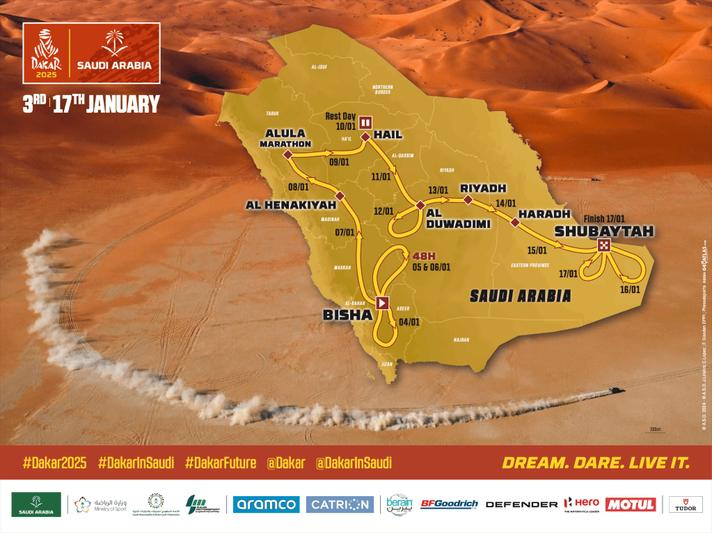 2025 will mark the 47th edition of the Dakar Rally and the sixth year the event takes place in Saudi Arabia. This year’s event will take competitors over 7,700km from Bisha to Shubaytah, featuring a return of fan-favorite challenges and a few new changes: